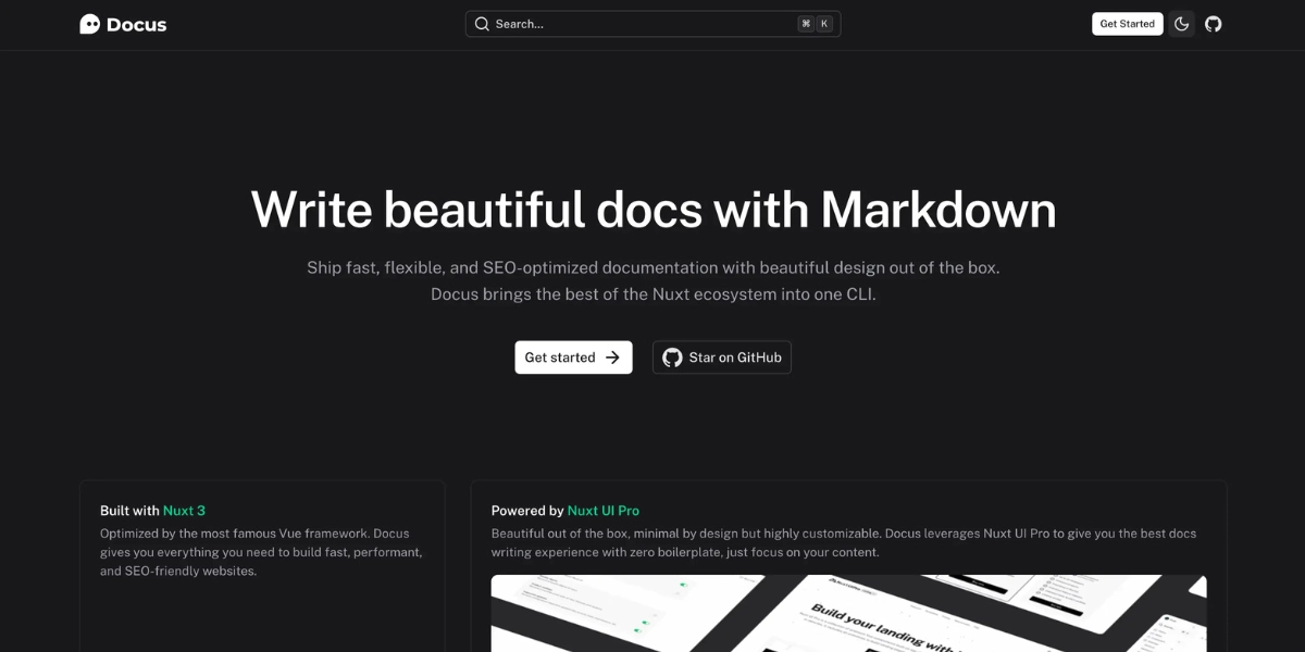 This is the default Docus starter template that provides everything you need to build beautiful documentation sites with Markdown and Vue components.